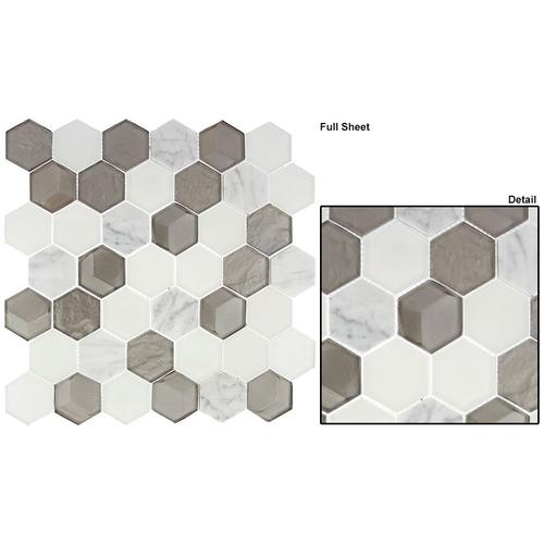 Introducing Aspen Grove: 2” Hexagon tiles on a 12” x 11 7/8” mesh sheet. Each sheet covers 0.99 SF with 42 tiles, 1/4″ thick. Grout joints are 1/8″ wide.