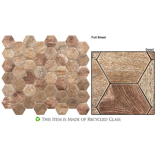 Introducing Autumn Maple: 2” Hexagon tiles on a 12 7/8” x 11 1/8” sheet. Each sheet covers 1 SF with 48 tiles in 8 rows. At 1/4″ thick with 1/16″ grout joints, this mesh-mounted product adds elegance to any space.