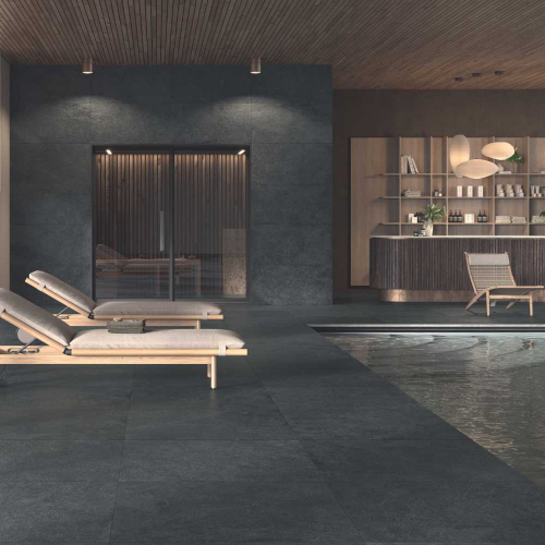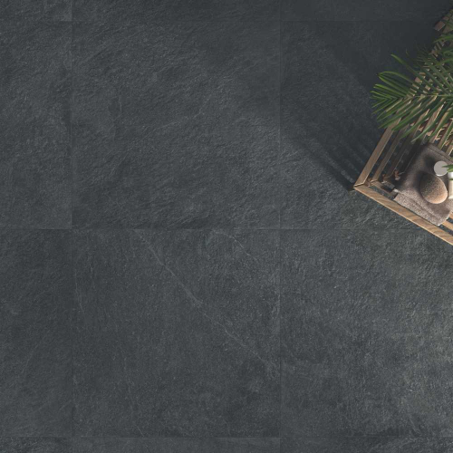 Black 40×40 porcelain tile features a matte black finish with a limestone-inspired stone style. This large-format square tile is perfect for indoor use in bathrooms, kitchens, floors, and walls. Durable and elegant, it adds a bold, modern touch to any space from the Antica collection.