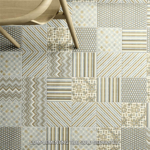 Introducing the Bohemia Matrix Ceramic Floor and Wall Tile. Elevate your space with mesmerizing geometric patterns in khaki and slate blue hues on an off-white base. This durable, frost-resistant tile is perfect for indoor and outdoor use. Made from natural ingredients, it’s allergen-free and safe for your home. Made in Portugal.