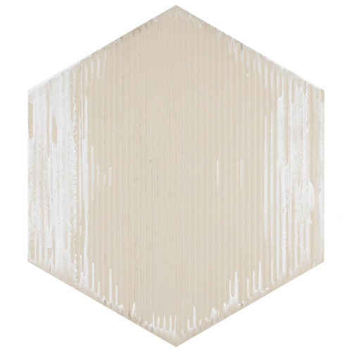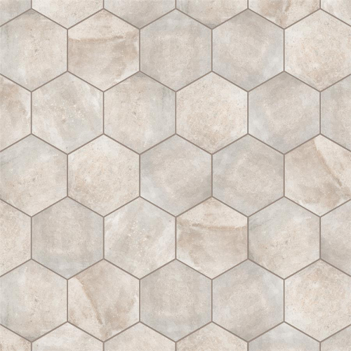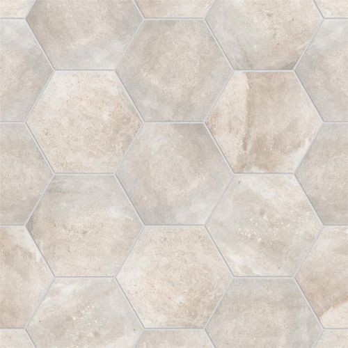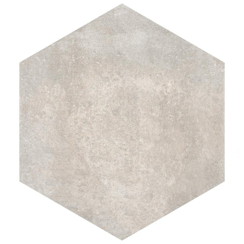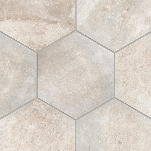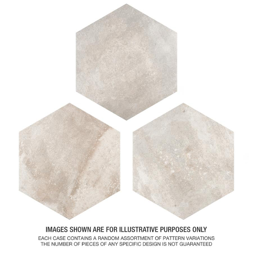 Introducing the Boston Ferro Hex Bianco Porcelain Tile, a rustic addition to any space. With unique variations in each case, this tile offers a one-of-a-kind look in antique white, beige, and taupe tones. Perfect for indoor and outdoor use, this tile is allergen-free and safe for pool areas. Made in Spain.