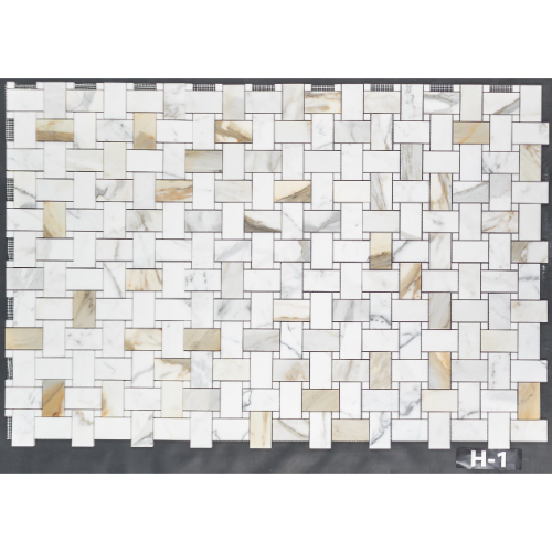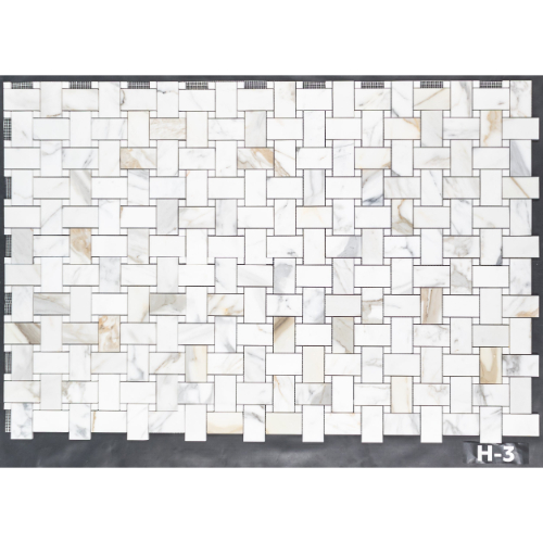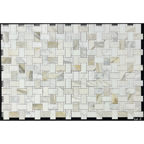 Featuring an extra-large basketweave pattern, this honed Calacatta Gold mosaic is accented with 5/8″ White Thassos dots. Its elegant blend of warm veining and crisp white highlights makes it ideal for refined floors or feature walls. Each sheet covers 1.72 square feet of luxurious, natural Italian marble.
