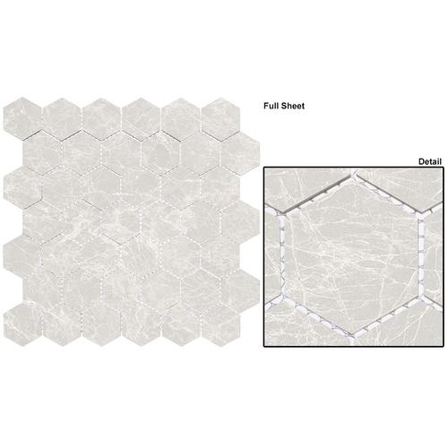 Introducing the Capella DCOF Matte Hex Mosaic, featuring 2×2″ tiles on a 12×12″ sheet. Made of porcelain with a DCOF Matte finish, PEI IV rating, and DCOF >0.42. Mesh-mounted for easy installation with recommended grout joint as per mosaic design.