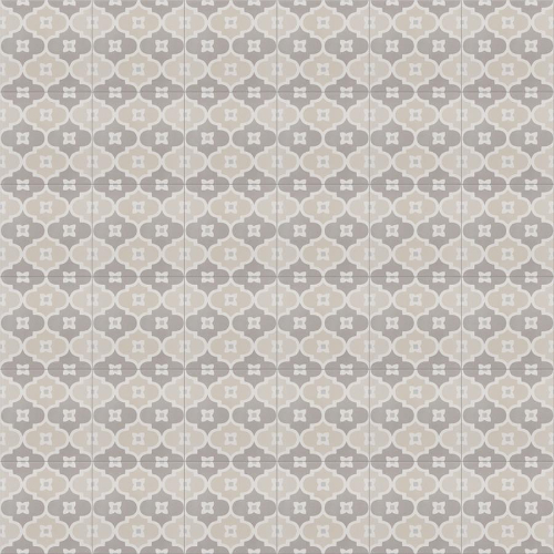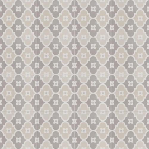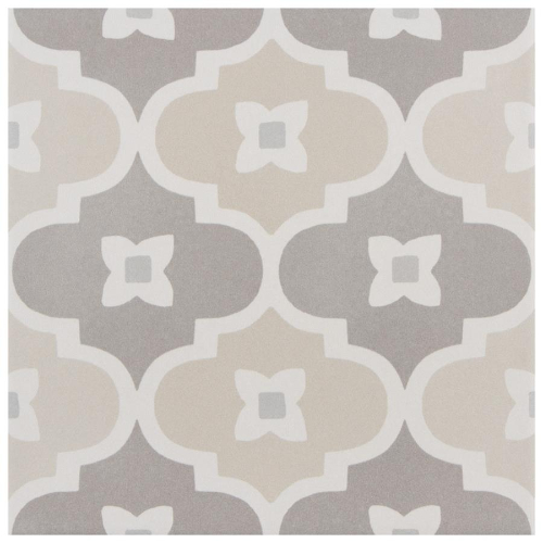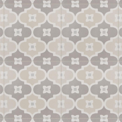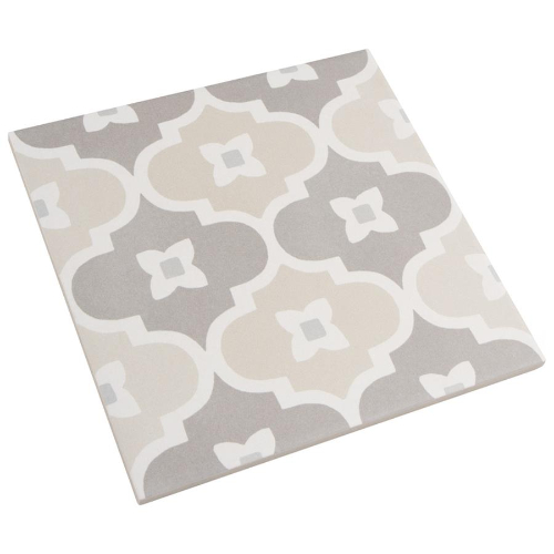 Introducing the Caprice Pastel Bowtie Porcelain Floor and Wall Tile. This Moroccan-inspired lantern pattern tile features taupe and sand hues with a touch of pale stone blue. With a matte glazed finish, it brings an encaustic look to any space. Durable, frost-resistant, and slip-resistant, perfect for various residential areas. Made in Spain.