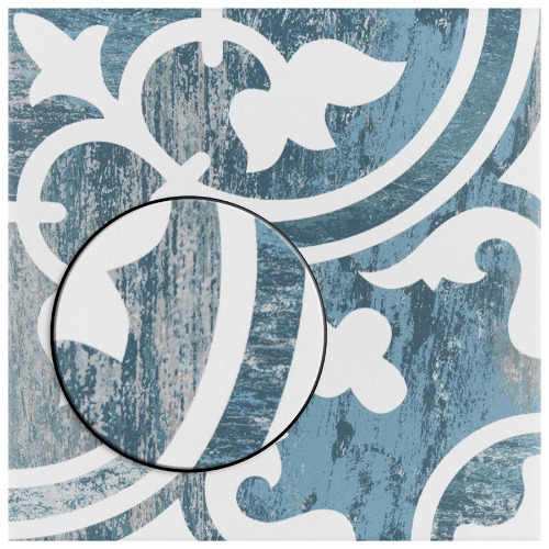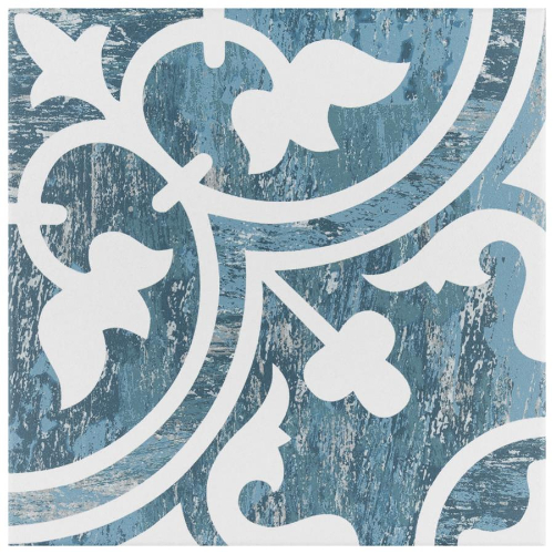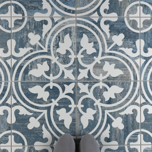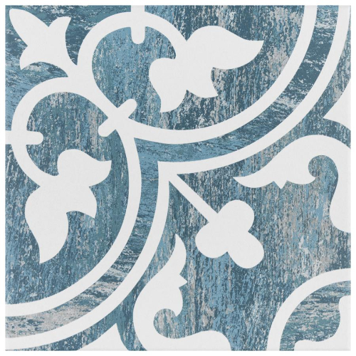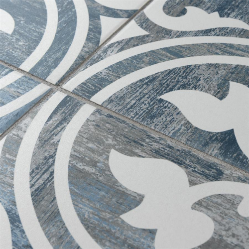 Introducing our Cassis Arte Blue Day Porcelain Floor and Wall Tile. Mimicking distressed wood with a floral old-world design in denim blue and grey tones. Featuring rich detail, mixed finish, and realistic woodgrains for visual dimension. Ideal for indoor/outdoor use, including backsplashes, floors, walls, showers, and patios. Made from natural ingredients, allergen-free. Origin: Spain.