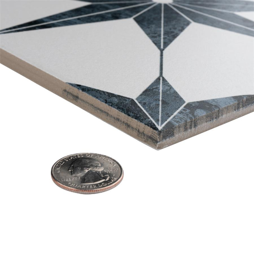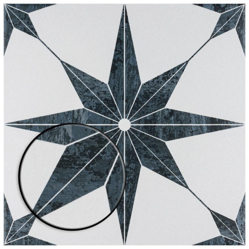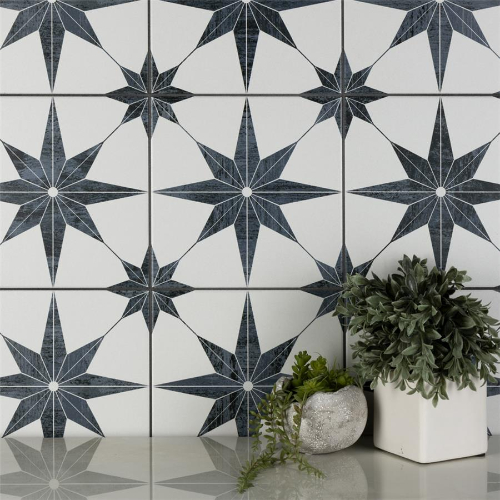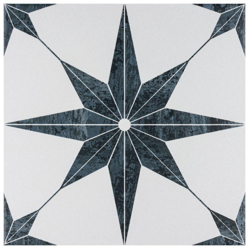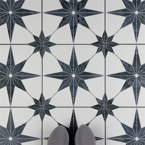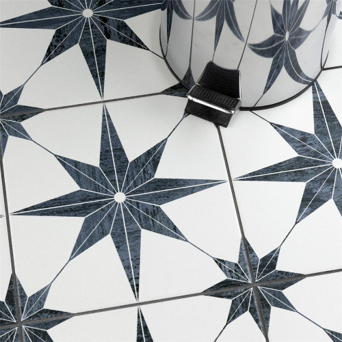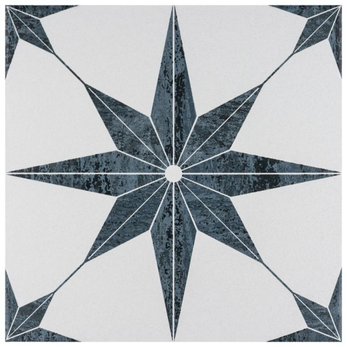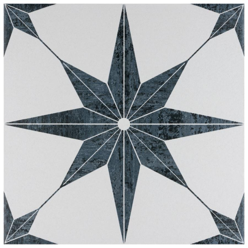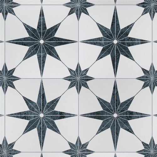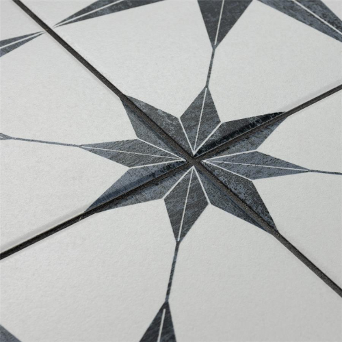 Introducing our Cassis Stella Black 9-3/4″ x 9-3/4″ Porcelain Floor and Wall Tile. This tile beautifully replicates the look of distressed wood with a geometric star pattern in faded charcoal black tones. With realistic woodgrains, it offers a textured finish for a unique installation. Ideal for indoor and outdoor use, including kitchens, bathrooms, and patios.…