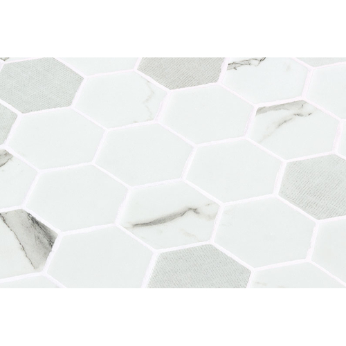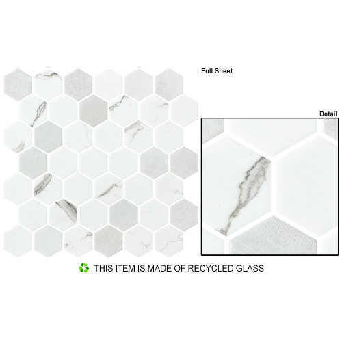 Introducing Casual Grace: 2″ Hex tiles in 11 1/8″x 11 1/5″ sheets. Each sheet covers .865 SQF with 7 rows of 42 tiles. Cut into borders every 2 rows, 3/16″ thick with 1/8″ grout joint. Dot mounted for easy installation.