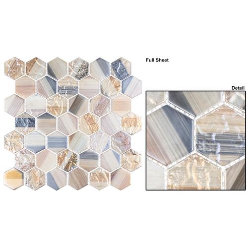 Introducing Coastline: 2″ Hex tiles on 11 13/16″ x 11 7/8″ sheets. Each sheet covers 0.97 SQF with 42 tiles at 6mm thickness. Featuring 7 rows, cut into borders every 2 rows with a 1/16″ grout joint. Mesh mounted for easy installation.