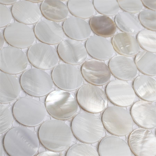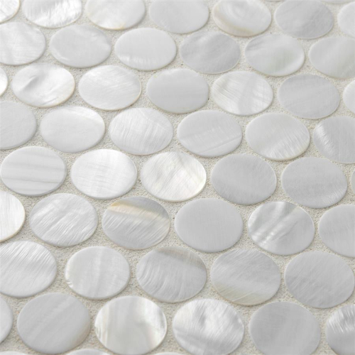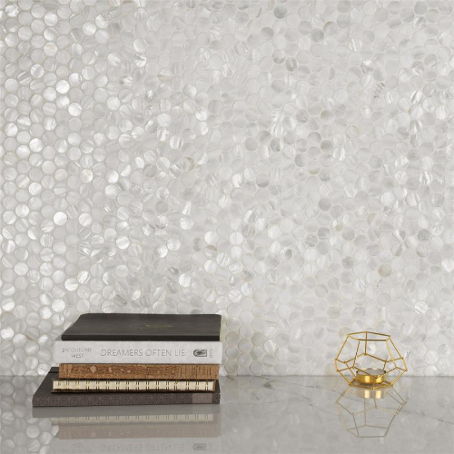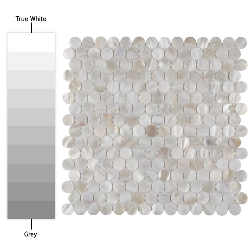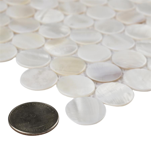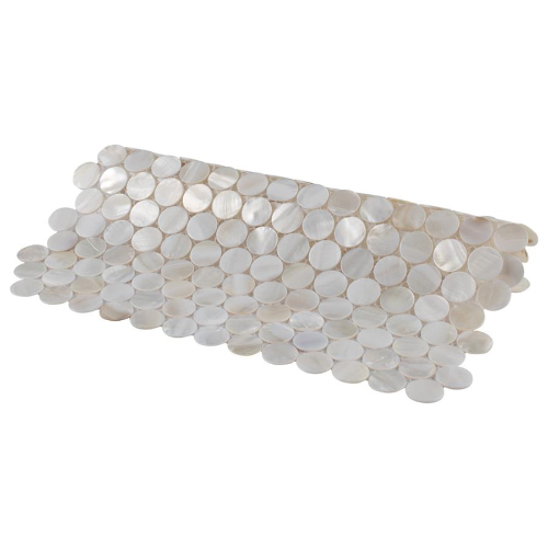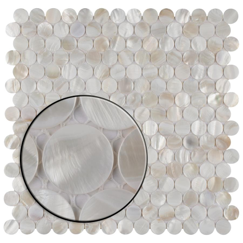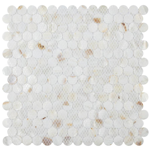 Introducing our Conchella Mini Penny White 11-1/2″ x 11-5/8″ Natural Seashell Mosaic Wall Tile. Embrace seaside tranquility with lustrous natural seashells, featuring iridescent penny-shaped chips in soft white and beige tones. Perfect for indoor and outdoor walls, this impervious and frost-resistant mosaic adds elegance to any space. Made in China.