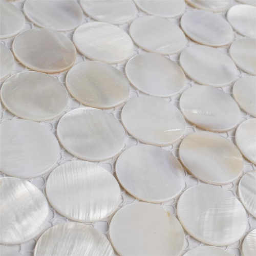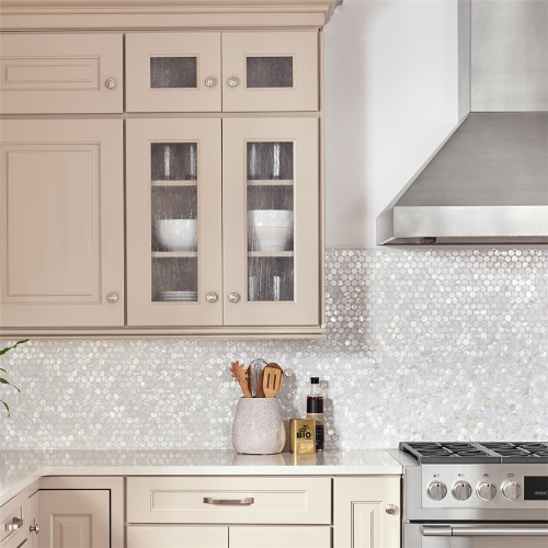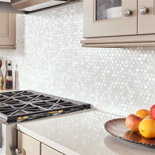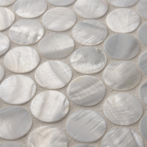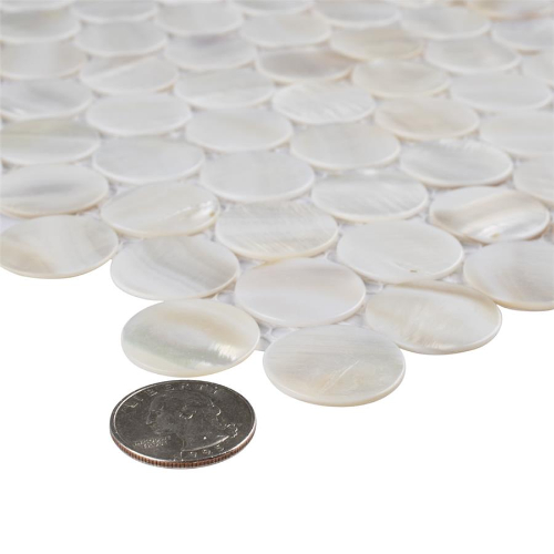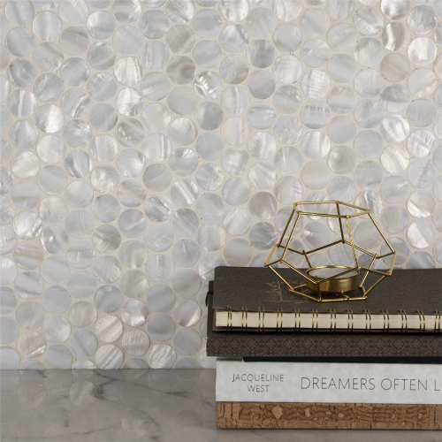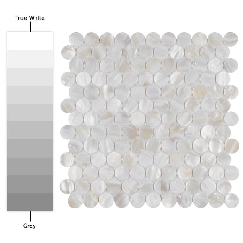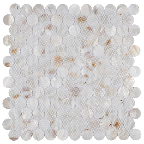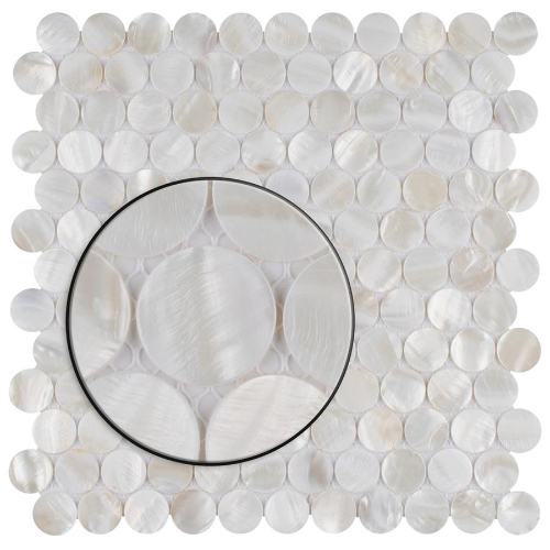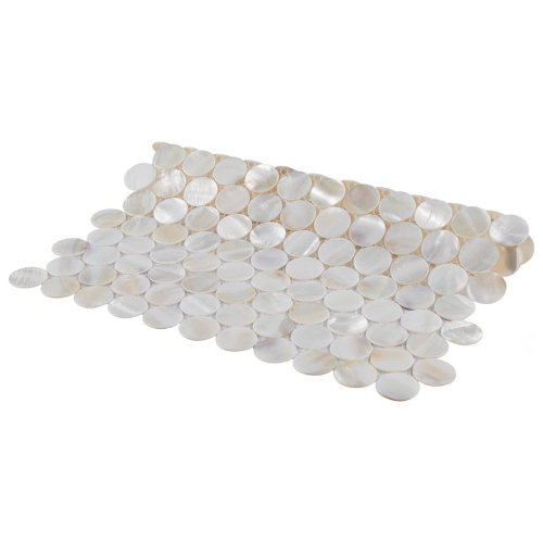 Capturing the lustrous beauty of natural seashells, our Conchella Penny White 11-1/4 in. x 11-5/8 in. Natural Seashell Mosaic Wall Tile emulates seaside-inspired tranquility. Featuring an exquisite blend of beautifully iridescent penny shaped chips that are constructed of natural seashells, this mosaic wall tile illuminates any space. Soft white and beige tones infuses this tile…