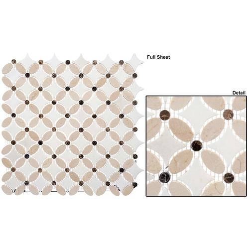 Enhance your space with the exquisite Crema Marfil, Emp. Dark, and Thassos mosaic tile. Featuring a flower shape, polished finish, and mesh-mounted for easy installation. Each sheet measures 13 1/8″ x 13 1/8″, covering 1.19 SQF with 192 tiles per sheet at 3/8″ thickness and 1/8″ grout joints.