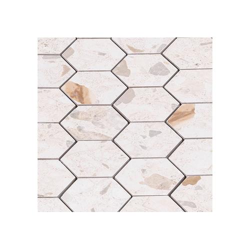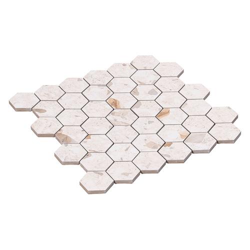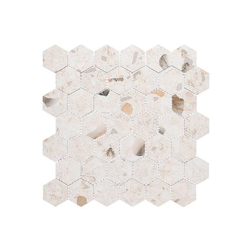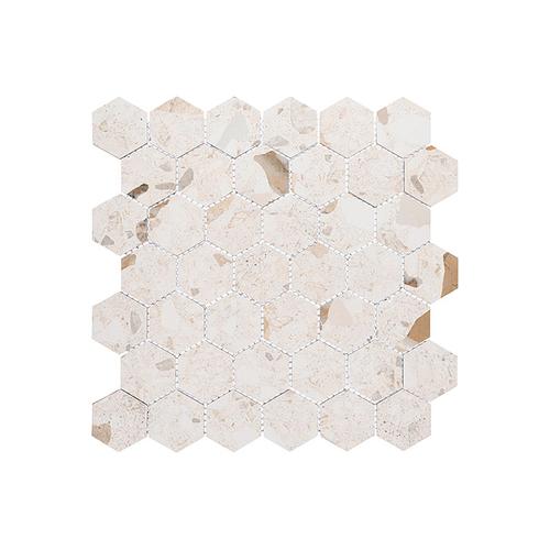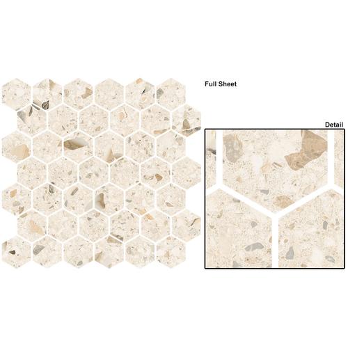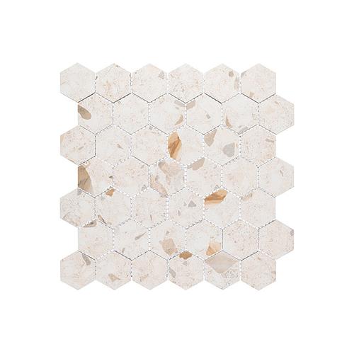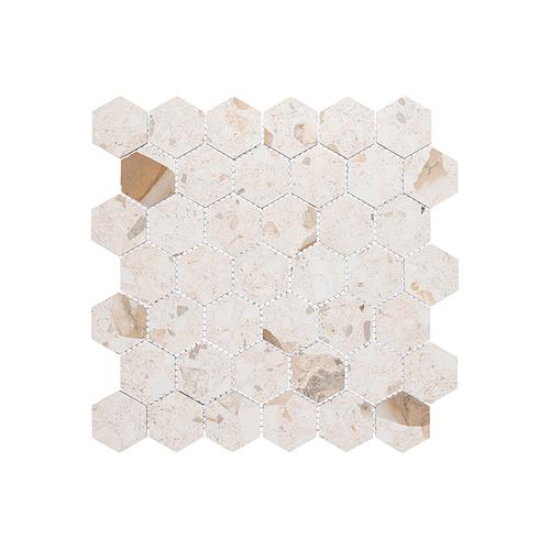 Introducing the Crescendo DCOF Matte Hex Mosaic, featuring 2×2″ tiles on a 12×12″ sheet. Made of porcelain with a DCOF Matte finish, PEI IV rating, and DCOF >0.42. Mesh mounted for easy installation with recommended grout joint as per mosaic design.