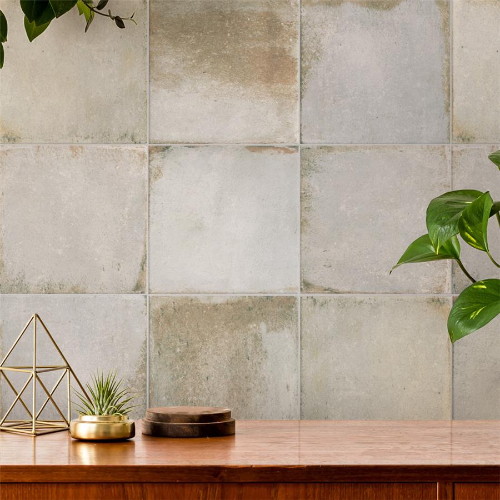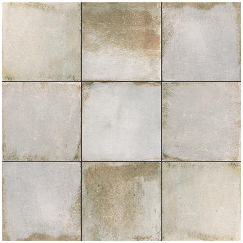 Introducing our D’Anticatto Bianco 8-3/4″x8-3/4″ Porcelain Floor and Wall Tile. Radiating rustic charm with a worn cement appearance, this tile features faded shades of grey and white, rust colored accents, and realistic scuffs and spots. Perfect for indoor and outdoor use, including kitchens, bathrooms, and patios. Made in Spain.