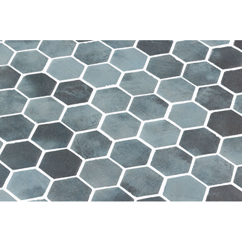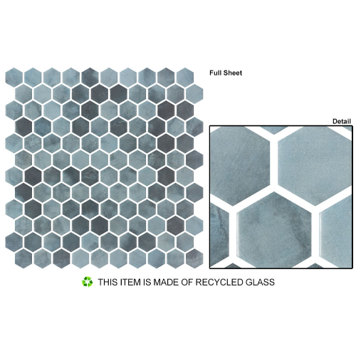 Introducing Java Lagoon: 1″ Hex tiles in 11 1/2″x 11 13/16″ sheets. Each sheet covers .943 SQF with 12 rows of 120 tiles. Borders cut every 2 rows, 5/32″ thick tiles with 1/16″ grout joint. Mesh mounted for easy installation.