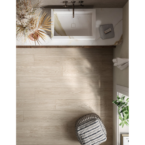 The Oudh Wood collection offers porcelain tiles with a refined wood look, featuring delicate and elegantly classic patterns. With perfectly balanced contrasts and natural knots, these tiles bring timeless beauty and sophistication to any space.