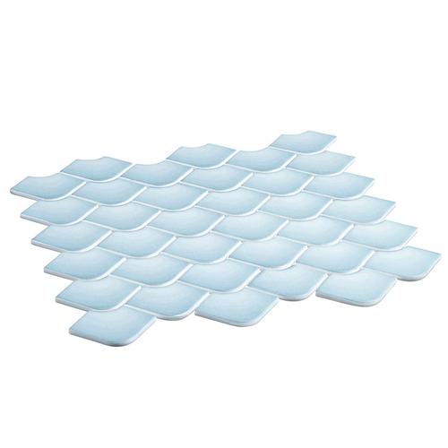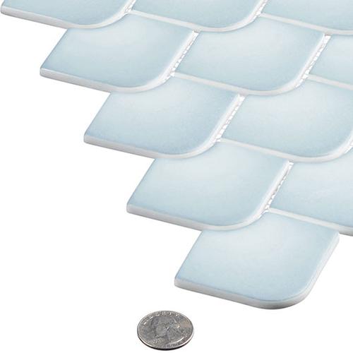 Introducing Naia: 2″ x 3″ nominal fish scale tiles, mesh mounted on 12 3/4″ x 13 1/4″ sheets. Each sheet covers 1.17 sqf with 6 rows of 36 tiles, 6mm thick.