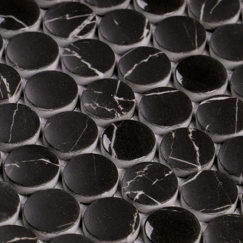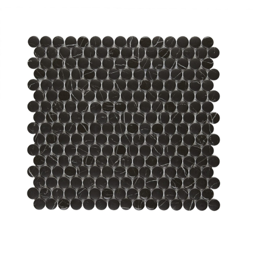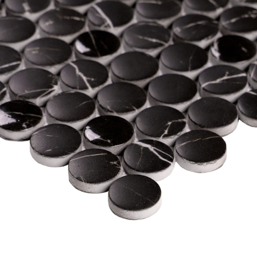 The Nero Pennyround mosaic features small, circular pressed glass tiles in a mix of matte and glossy finishes. Mounted on a mesh sheet for easy installation, it’s perfect for adding a modern, textured look to residential or commercial walls and floors. Stylish, durable, and visually striking.