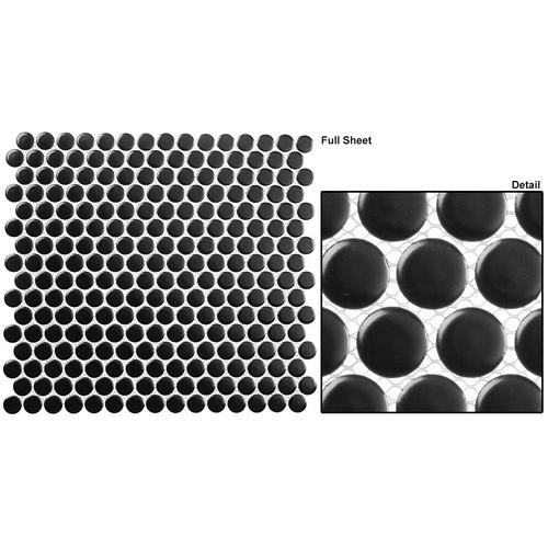 Elevate your space with Pitch Raven 3/4″ Penny Round Matte tiles. Each sheet measures 11 3/8″ x 12 15/16″ and covers .97 SQF. With 16 rows and 240 tiles per sheet, these 3/16″ thick tiles are mesh-mounted for easy installation. Cut into borders every 2 rows with a 1/16″ grout joint.
