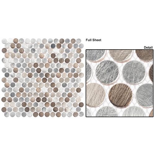 Introducing Prism Road: ¾” penny round tiles in 11 4/5″ x 11 4/5″ sheets. Each sheet covers .97 SQF with 16 rows of 224 tiles. Cut into borders every 2 rows, 5/16″ thick, with 1/16″ grout joint. Mesh mounted for easy installation.
