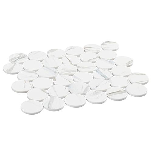 Introducing Silaven: 2″ nominal circle tiles on a 10 1/8″ x 11 5/8″ sheet. Each sheet covers 0.82 sqf with 6 rows of 36 tiles, 6mm thick, all mesh-mounted for easy installation.