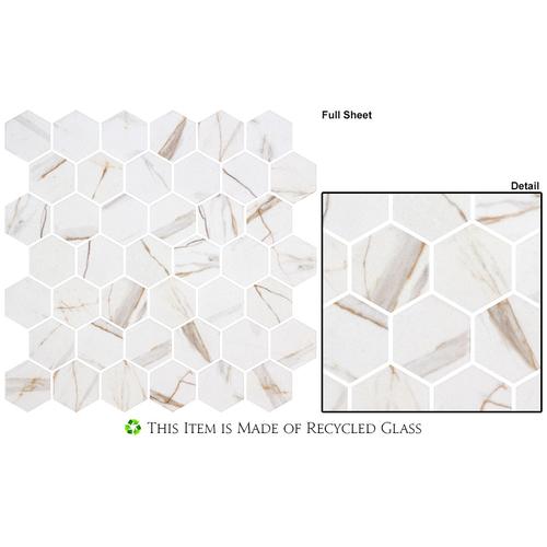 Sun Rays feature 2″ hex tiles on 11 1/8″x 11 1/5″ sheets, covering .865 SQF each. With 7 rows and 42 tiles per sheet, they are 3/16″ thick with 1/8″ grout joints. Dot mounted and sold in boxes of 6 sheets, perfect for creating stunning borders every 2 rows.