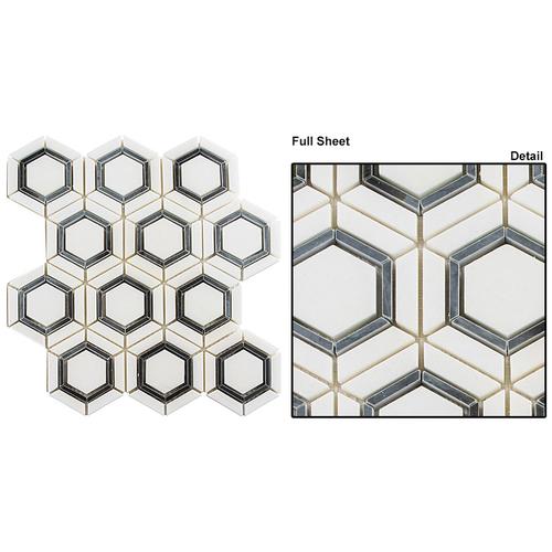 Introducing White Celesta: Full Hex 3 1/4 tiles on 11 ½” x 10” sheets, covering .80 SQF. Each sheet holds 156 tiles in 3 rows, cut into borders. 3/8 (10 mm) thickness with 1/16 (2 mm) grout joint. All tiles are mesh mounted.